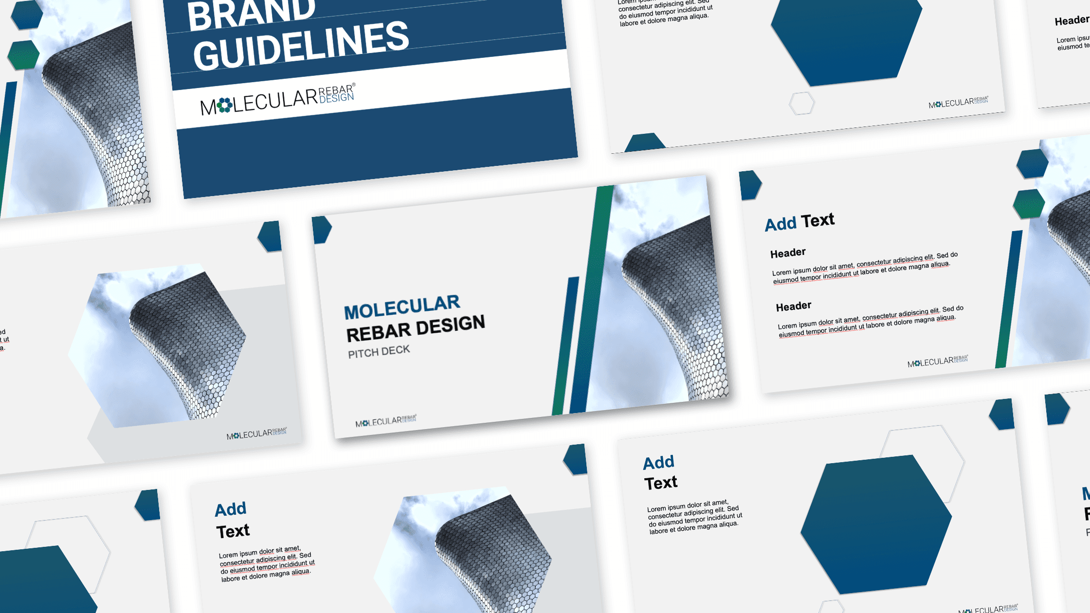 A combined brand refresh and pitch deck for Molecular Rebar Design, building a cohesive visual identity system and translating highly technical science into a clear, investor-ready presentation.